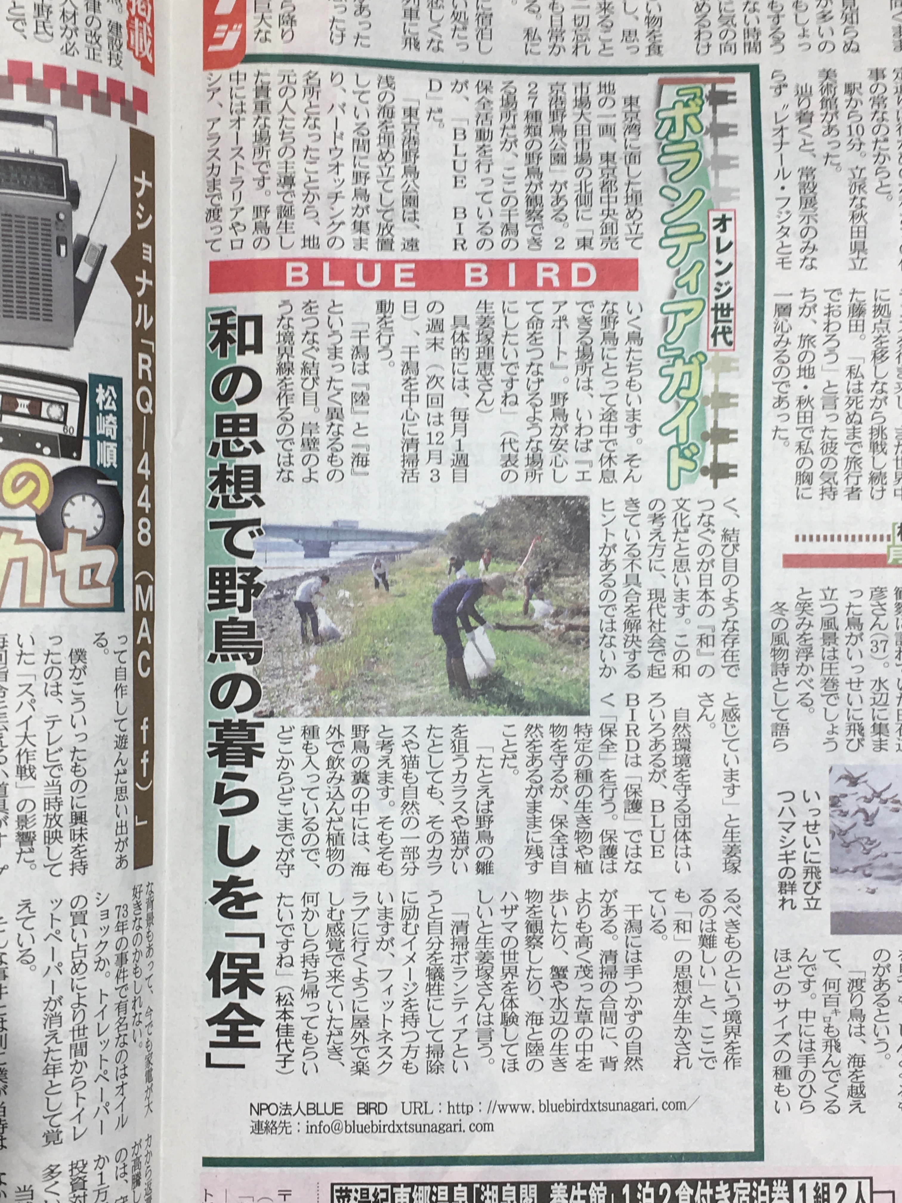 朝日新聞・環境特集「レッツeco活」で、BLUEBIRDの活動が紹介されました。記事では、東京港野鳥公園での環境保全活動の様子が登場しています。