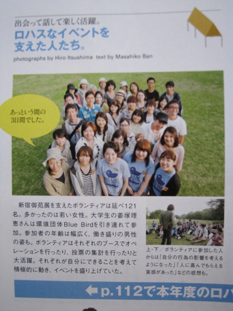更に、第2特集「ロハスデザイン大賞2013新宿御苑展レポート(5月開催)」の中では、ボランティア参加したBLUE BIRDメンバーの活躍の様子が写真を交えて紹介されています。