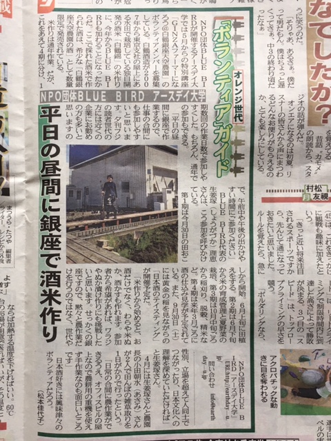 夕刊フジ「オレンジ世代・ボランティアガイド」で、BLUEBIRDが企画したアースデイ大学の特別講座「GINZAファーマーになろう@白鶴銀座天空農園」が紹介されました。